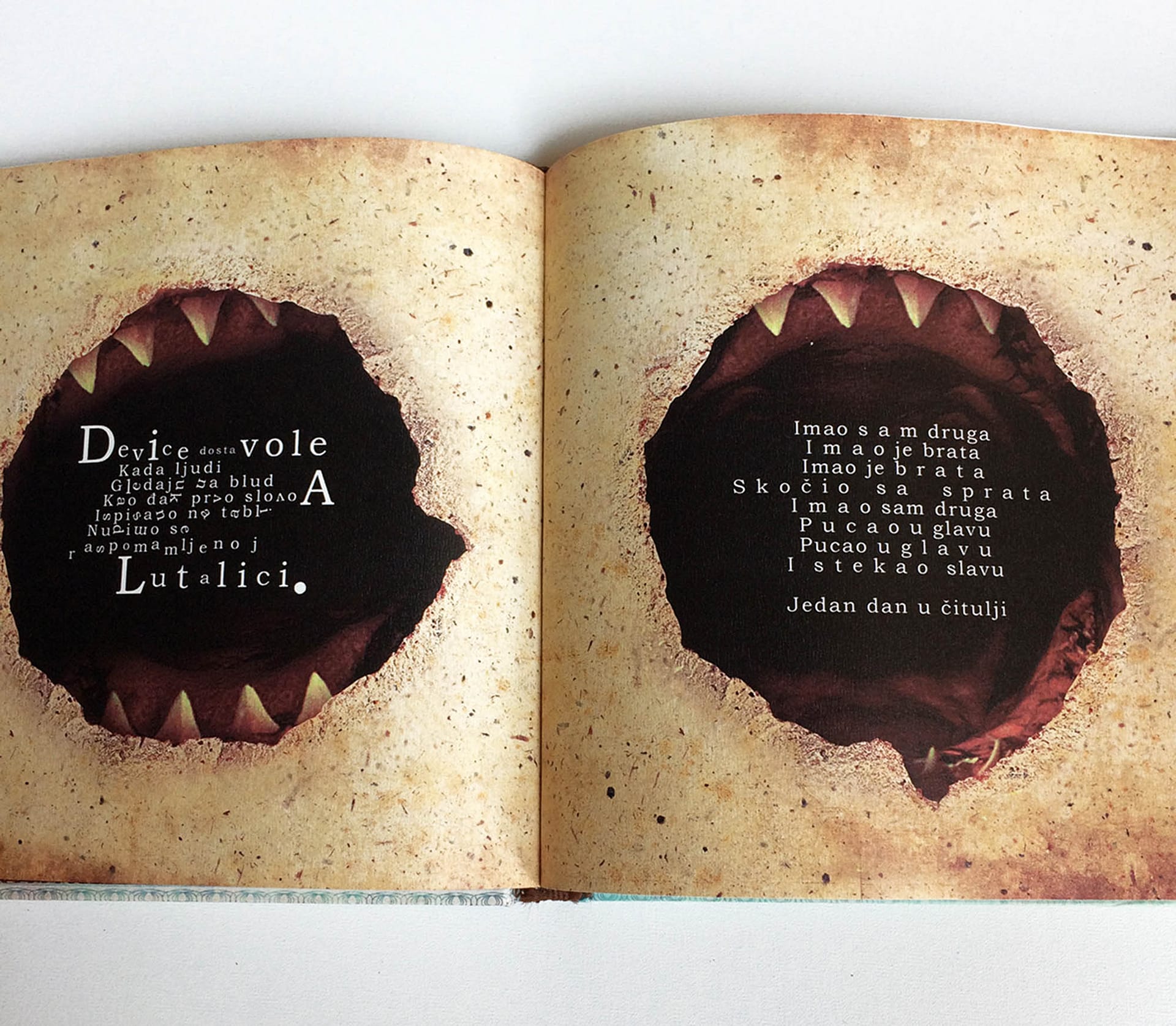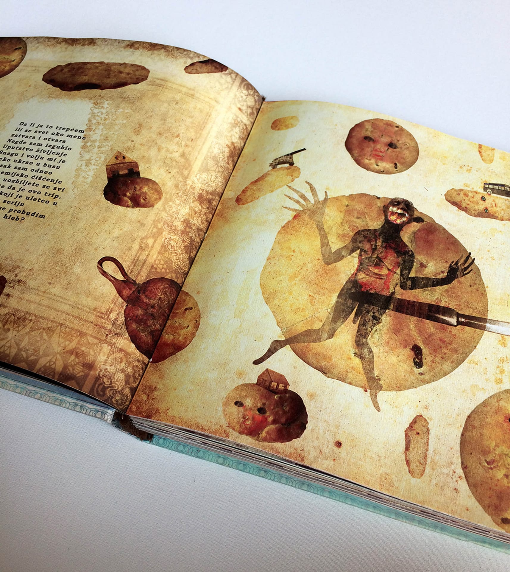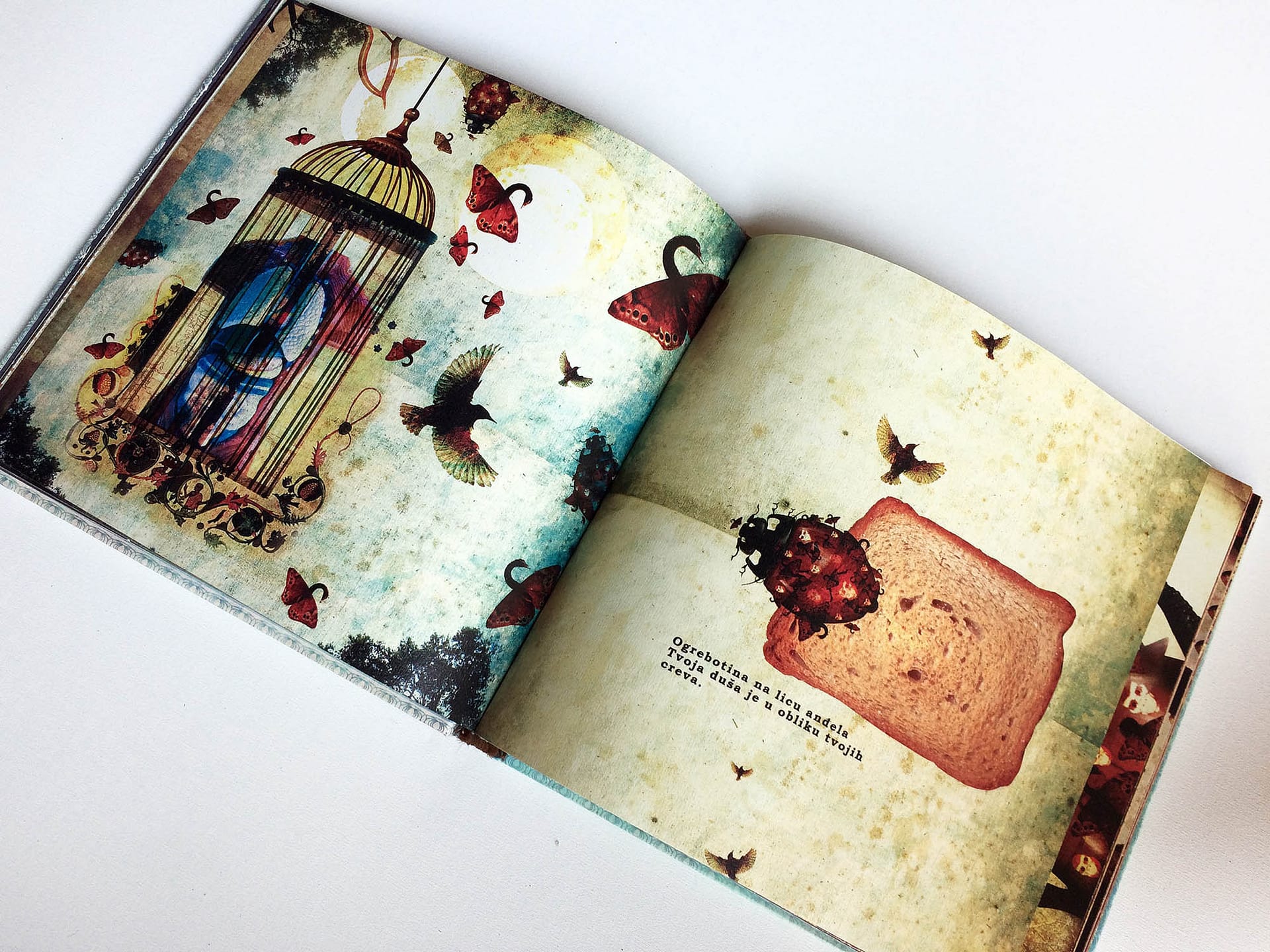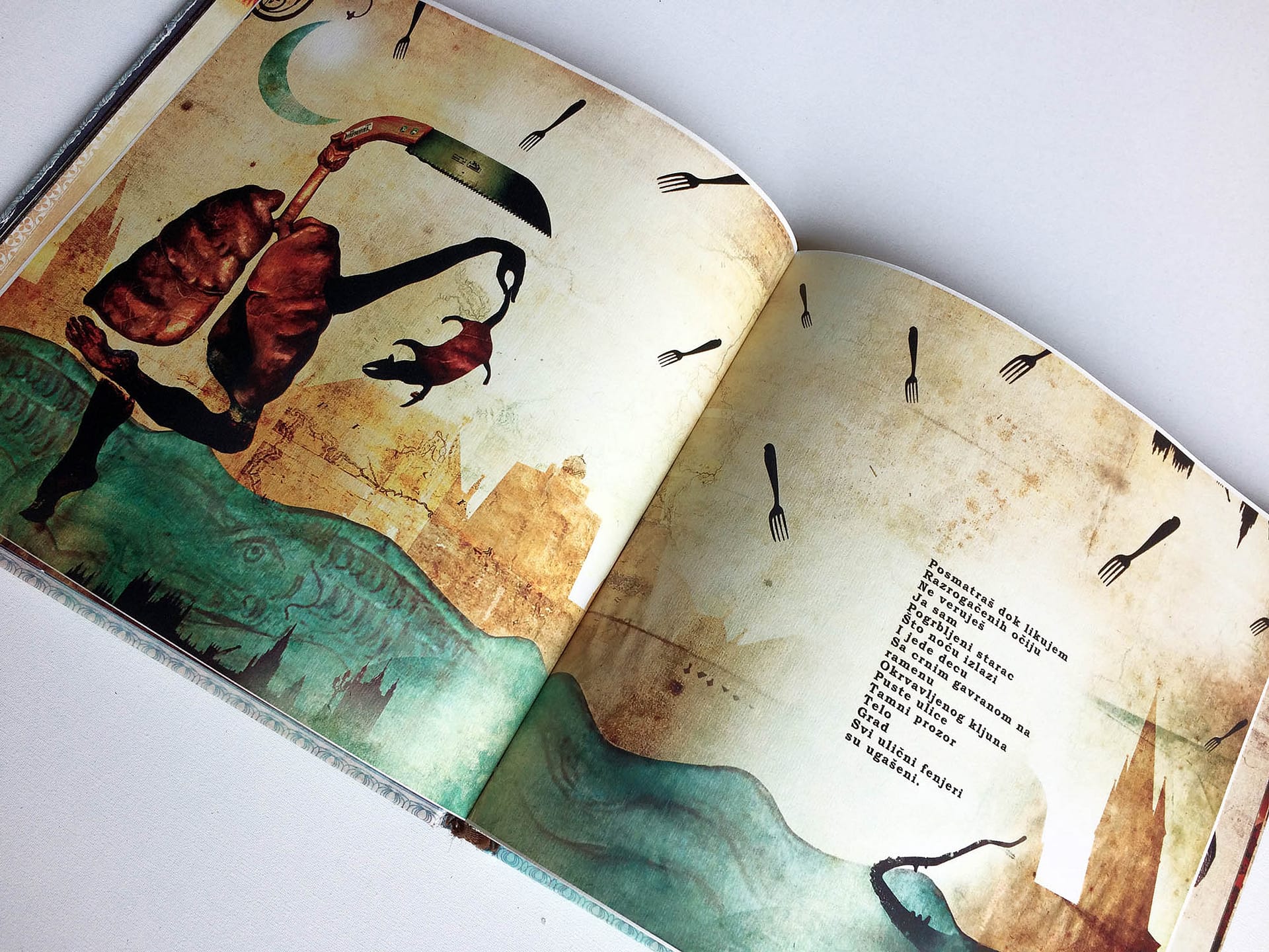 I was experimenting with the dark but still poetic irony and criticism, keeping the viewer on the surreal and narrative ground, where a major part of the characters simply reflects us – humans in an eternal struggle with life and existence. This book was created during two years of my (MFA studies) at the Academy of Arts Novi Sad – department of graphic design and illustration.