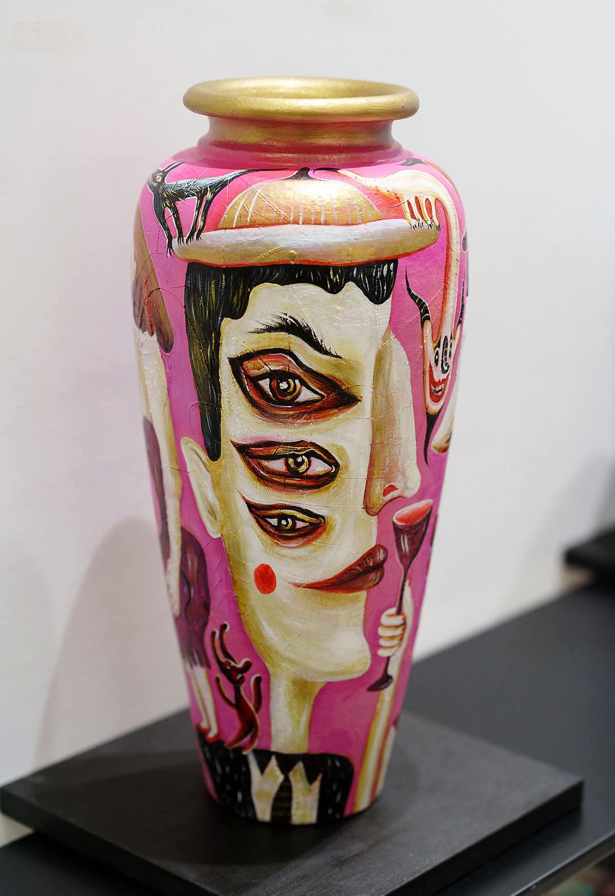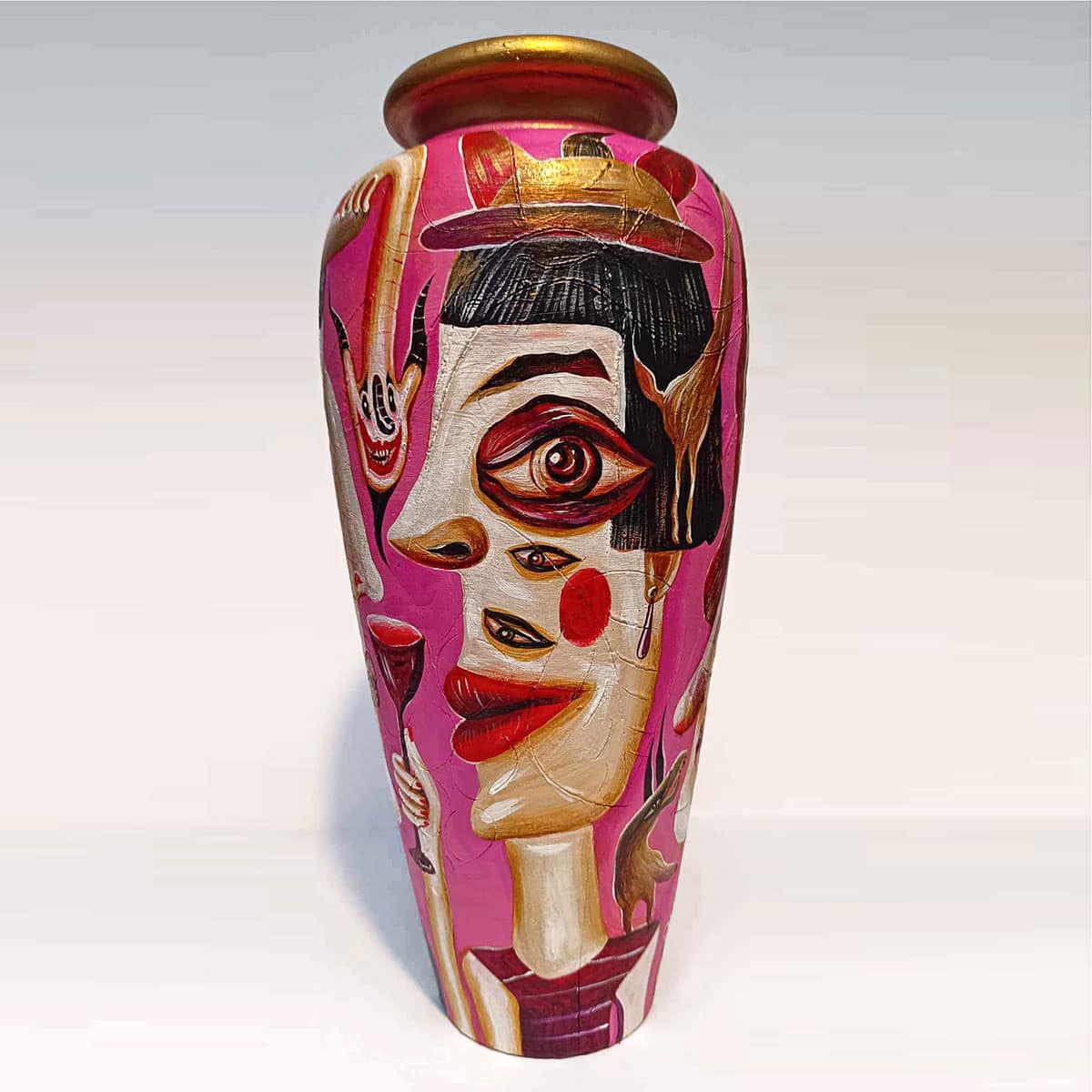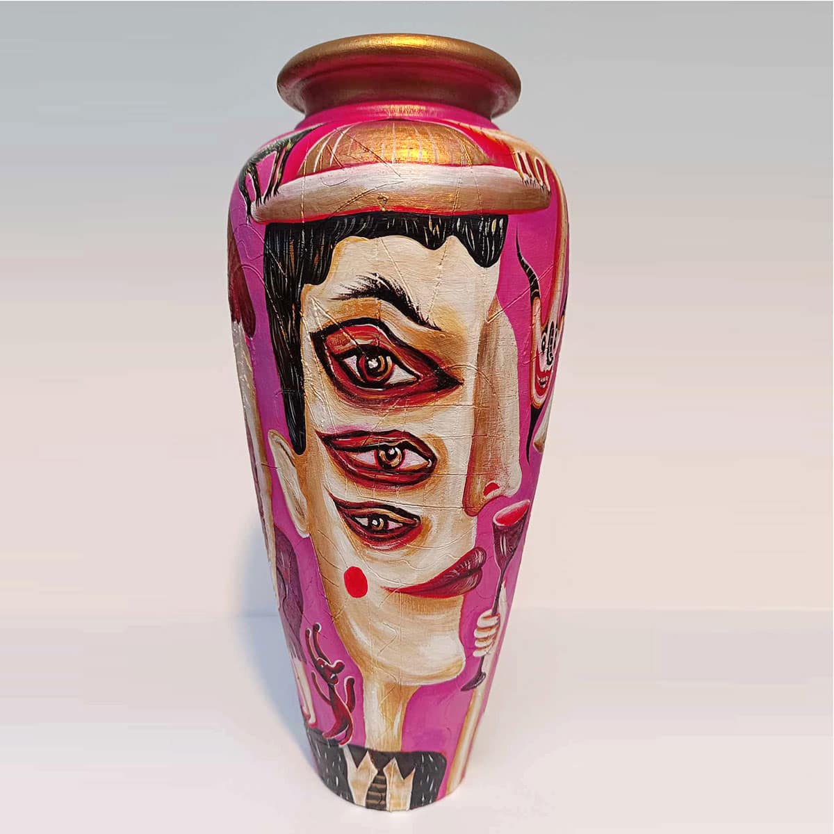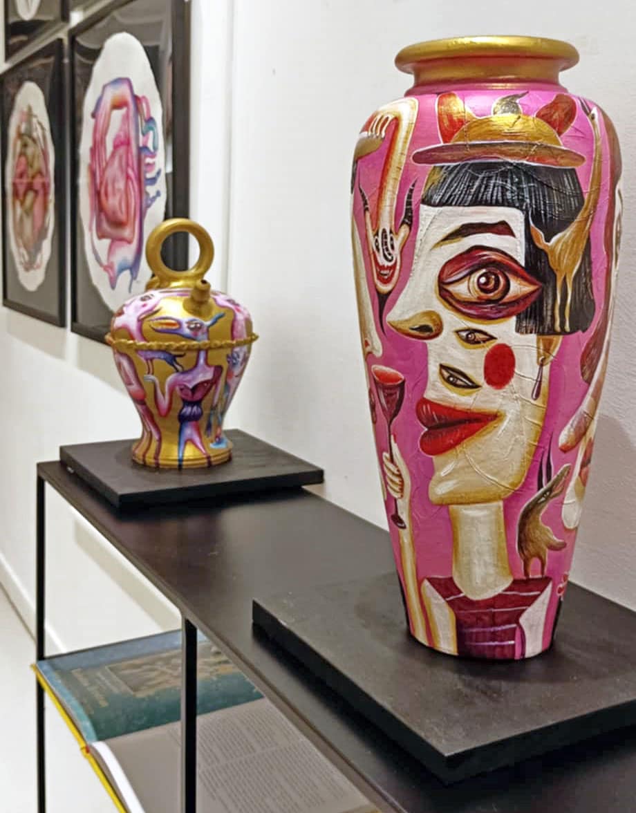 It’s been a blast unleashing my wild imagination on these reclaimed vessels — a little magic, a little mischief, and a whole lot of fun! “Painting follows the form” is the motto of this series. It explores the association between two-dimensionality and three-dimensionality, extracting paintings from the canvas—transforming them from seemingly flat surfaces into lively entities. My goal is to infuse playfulness and experimentation, spanning the commercial and fantastical realms. Bridging the gap between practicality and wonder, this series blurs the lines between art, decoration, and design!