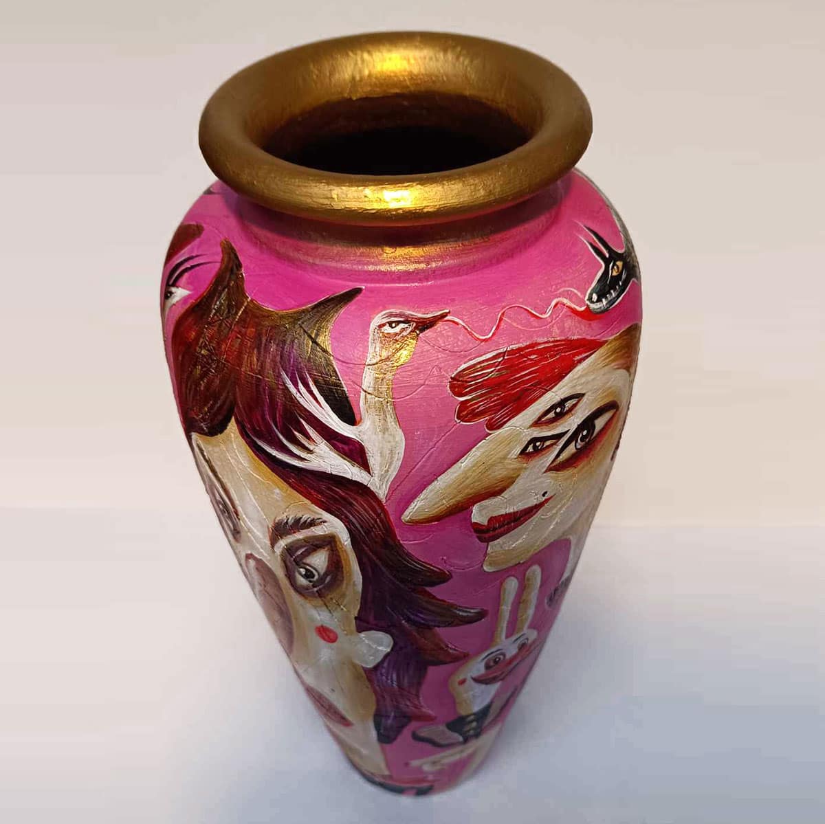 Step into the wild world of the “Fantastic Fauna” series, a collection where quirky creatures come to life on selected handmade vases and jars. These playful pieces transform recycled ceramics into a canvas for my mischievous monsters to dance, prowl, and party in golden splendour. Each stroke of paint breathes new life into these objects, turning them into vibrant, one-of-a-kind treasures brimming with character and whimsy.