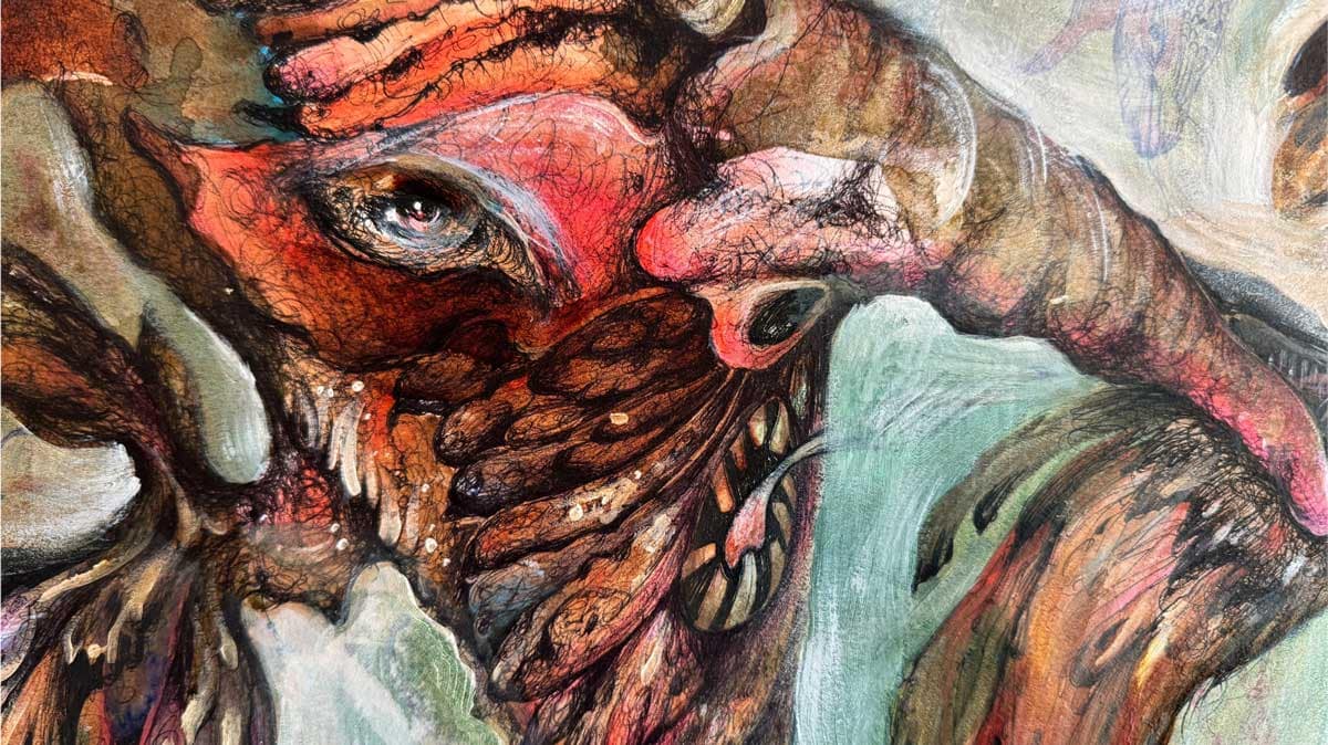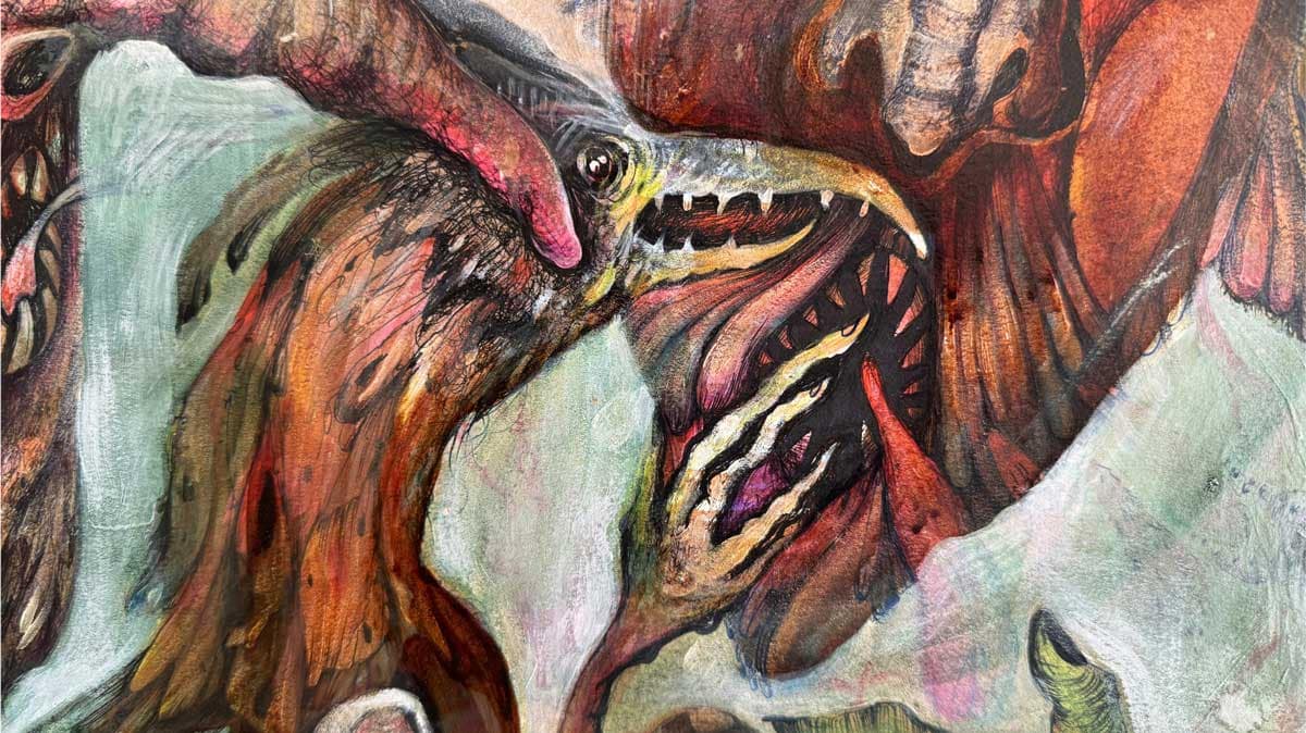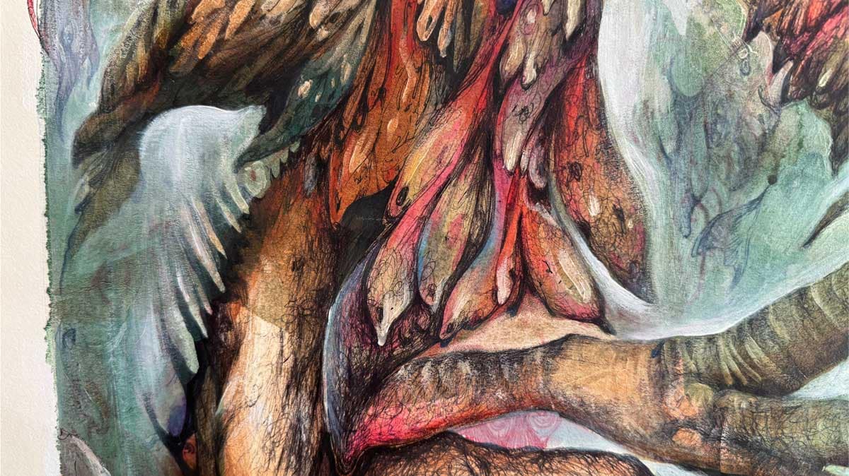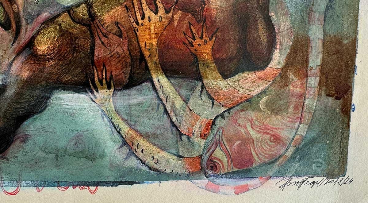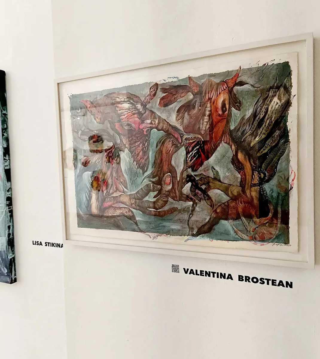 Valentina Brostean captures the essence of mutant characters, each embodying deep-seated anxieties, torments, and passions. Her work is a labyrinth of emotions, where symbols intertwine to represent the multifaceted nature of human emotional states. Brostean constructs a realm where her creatures navigate a landscape of turmoil and melancholy, mirroring the complexities of the subconscious. The artwork portrays the artist’s inner struggles and the timeless battle between rage and sorrow.
