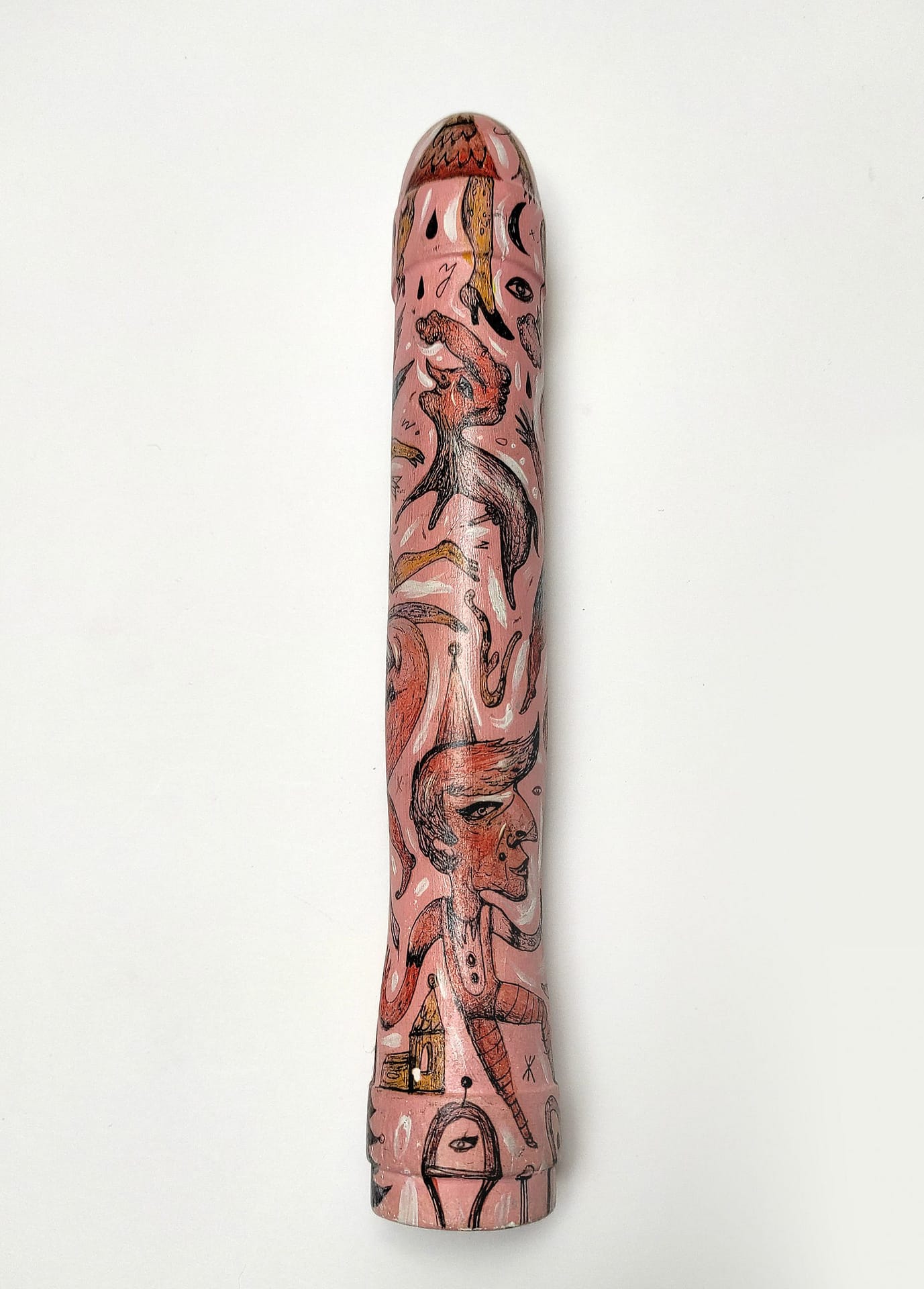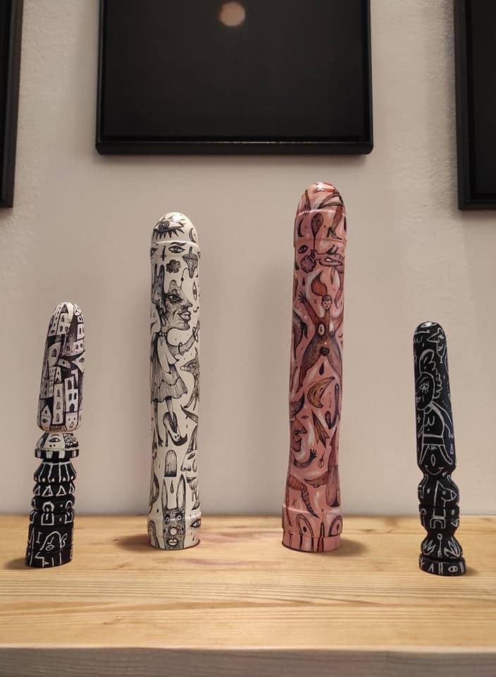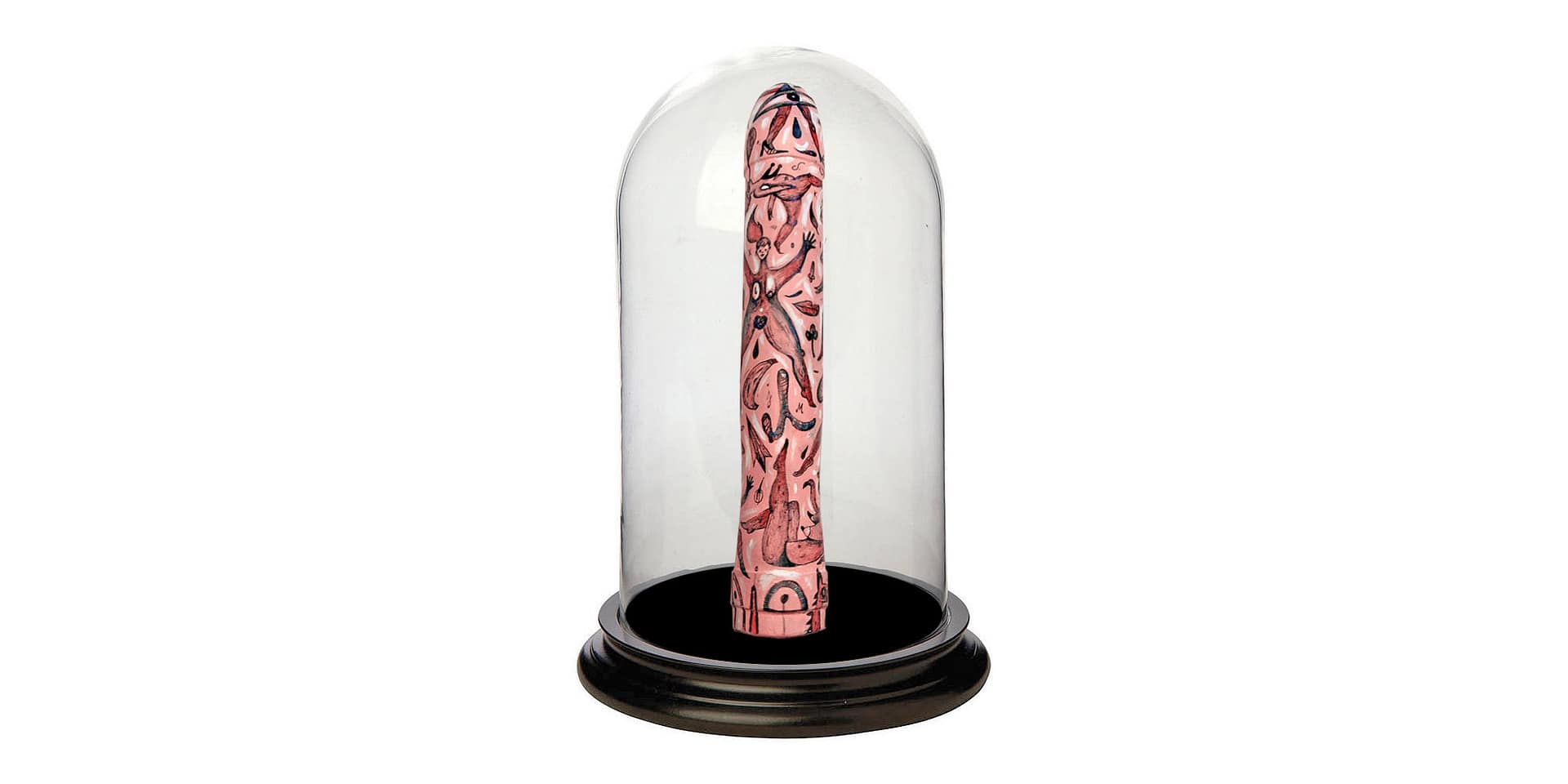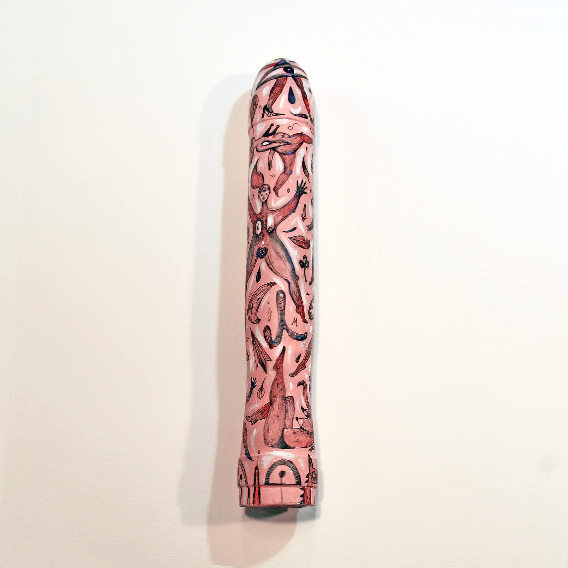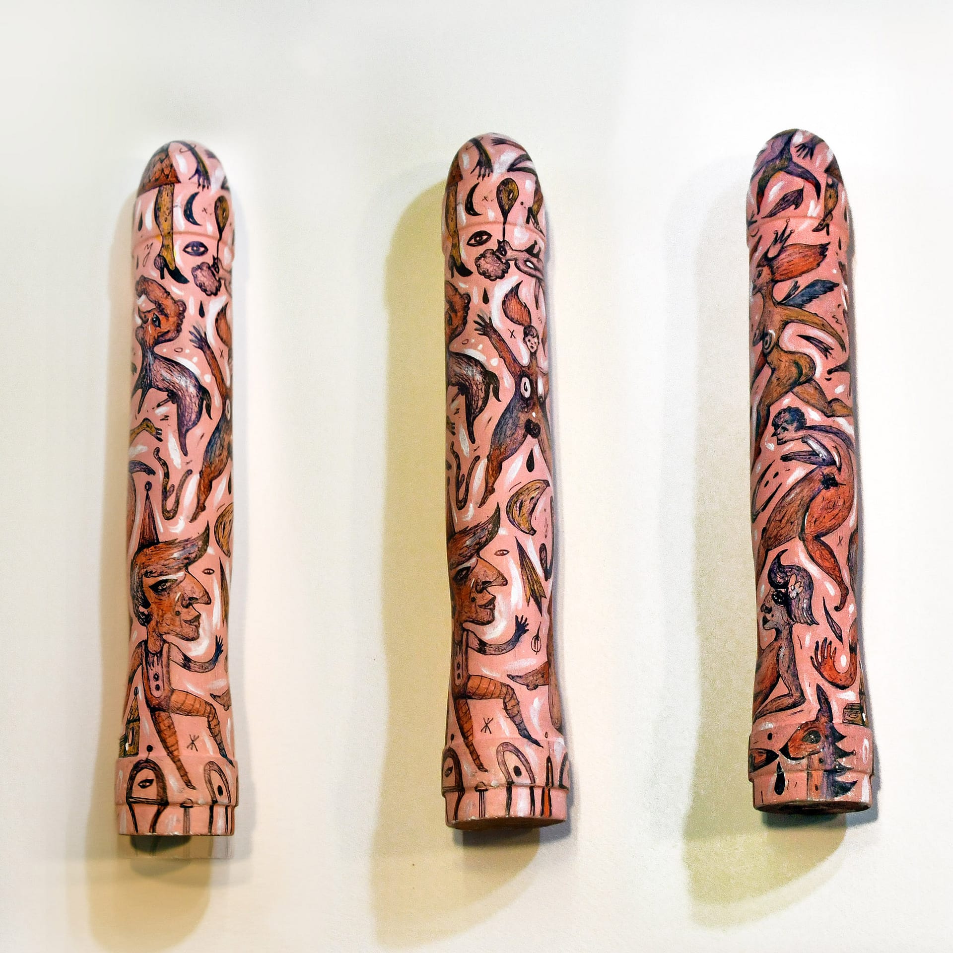 These hand sculpted and painted phallus sculptures represent objects that celebrate human freedom, even as they provoke us to acknowledge how unfreely we actually live – how we conspire with society to keep ourselves from satisfying our natural desires. It is a seductive work that exemplifies, even as it studies, the playful perversity of human desire.